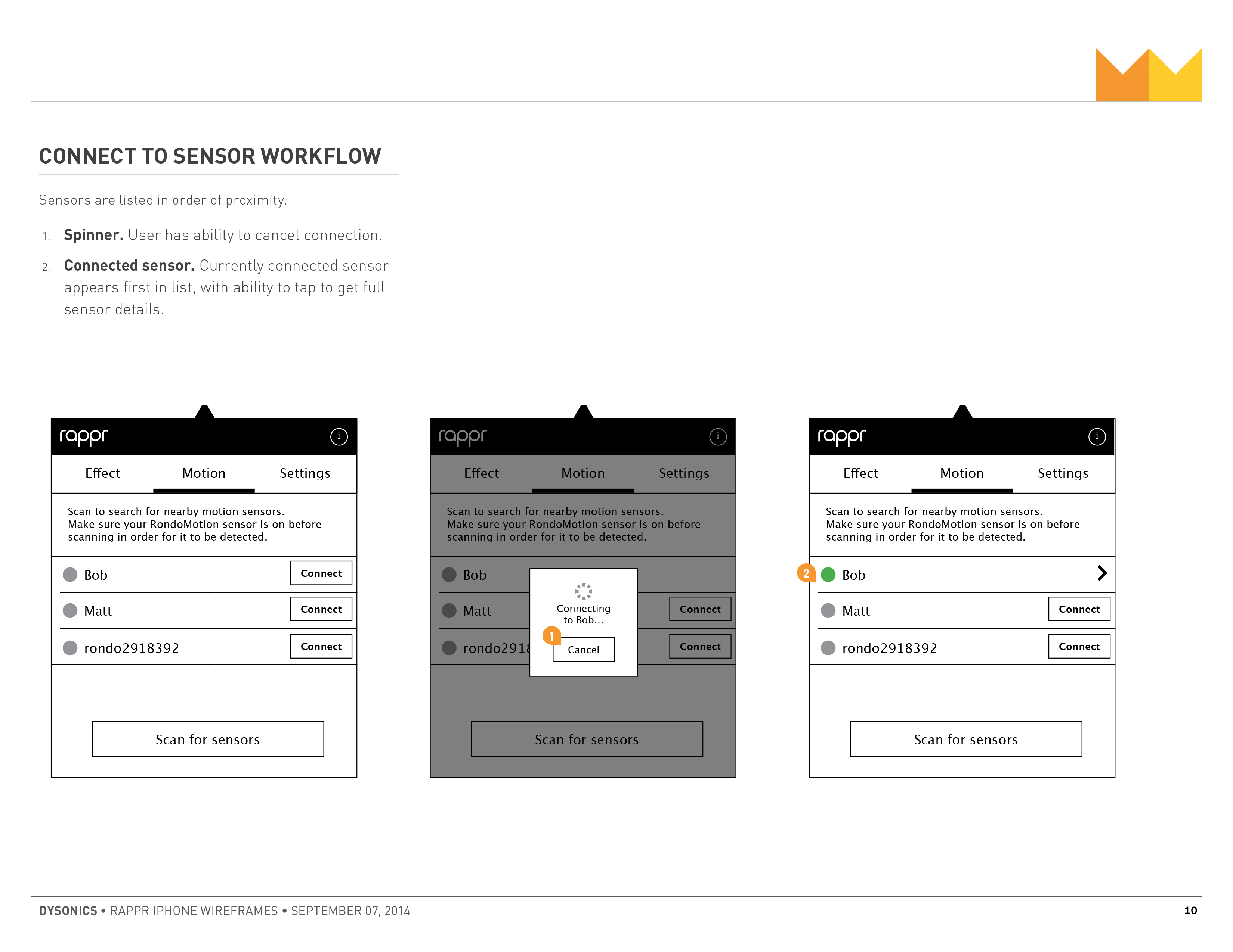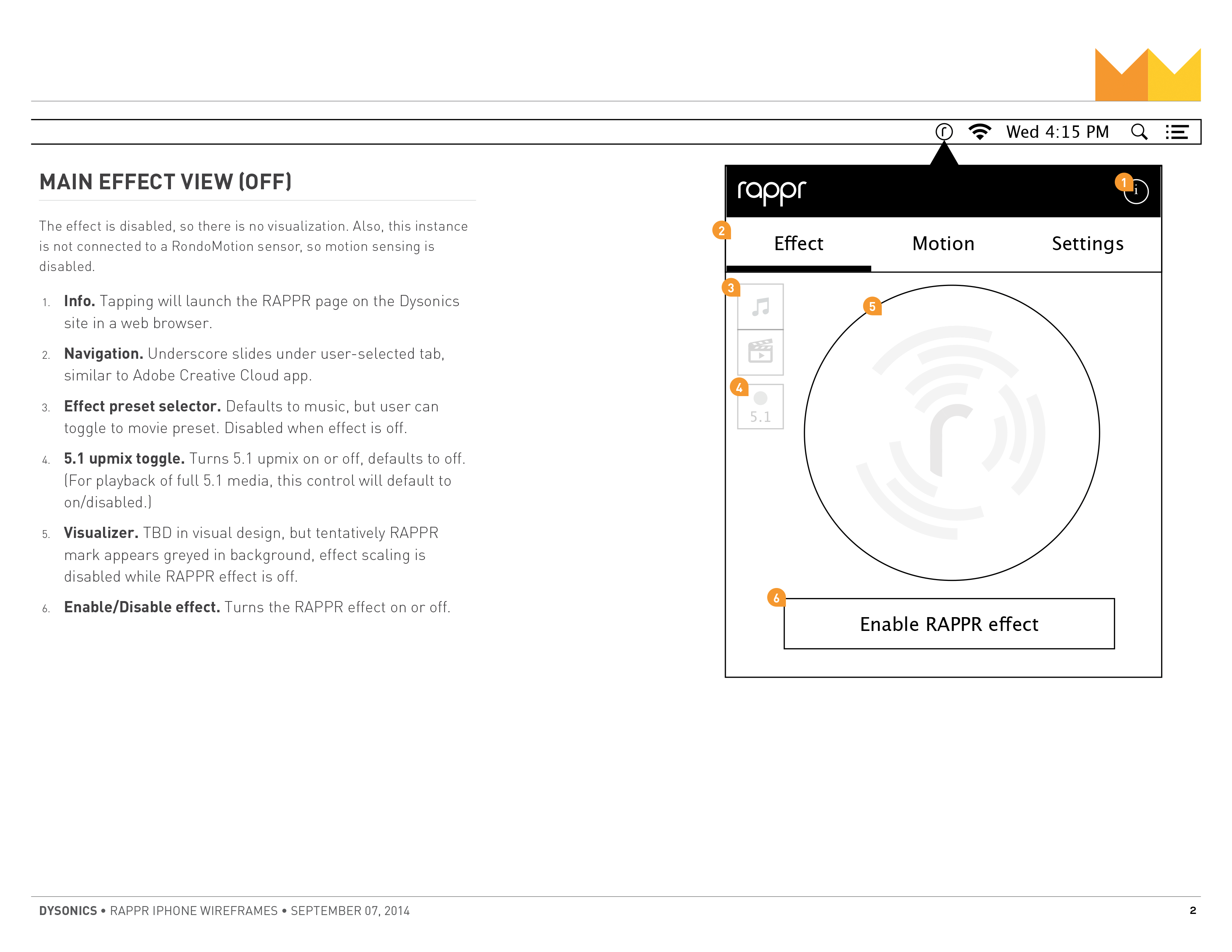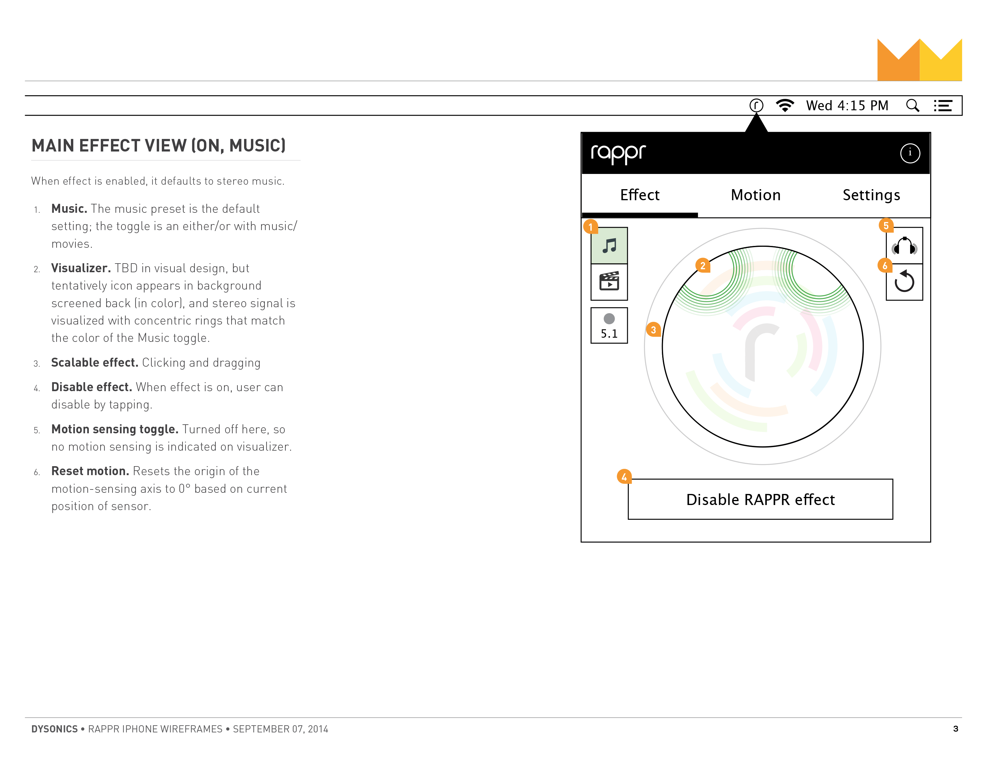 Like other products developed by Dysonics, the engineering team, led by the company CTO, largely defined the requirements of the software based on a set of proven capabilities. It served as a vehicle for their IP as much as a consumer-facing product. The interface needed to allow users to scale the simulated environment spatially while reflecting position of the user’s head relative to the sound signal. The app also had to facilitate the pairing of Dysonics’ Bluetooth motion sensor, RondoMotion, the accompanying use of which harnesses the full capability of the software. The architecture of the software is relatively simple, and many of its UI challenges bridged both UX and VX. On the UX side there was the challenge of organizing its features and its hardware-pairing workflow, while on the VX side there was the challenge of actually visualizing the sound, its relationship to the user, and the effect’s mode (video, audio, or 5.1).